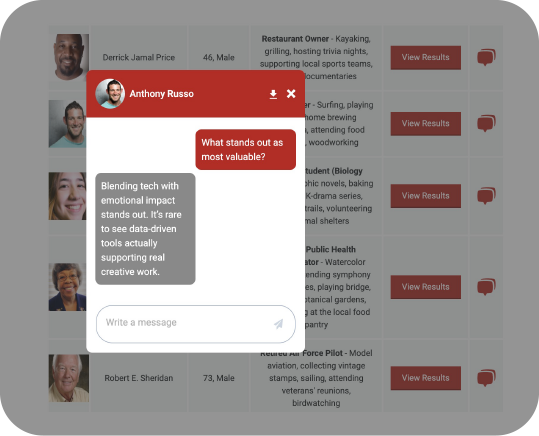 Ask custom questions, use templates, and receive detailed qualitative answers or chat 1-to-1 with each simulated persona for deeper understanding beyond surface-level metrics.